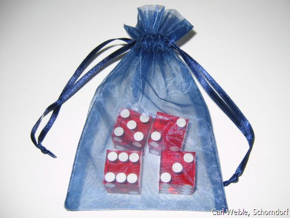 4 fabrikneue Casino Würfel aus rotem Acrylglas Kantenlänge 19 mm, in blauem Organzabeutel