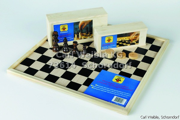 Schach Schach, Dame und Backgammon Kassette, Holz bedruckt, Feldgröße 30 mm, Schachfiguren aus Holz, Königshöhe 60 mm, Dame und Backgammon-Spielsteine aus Holz, Geschenkkarton 150202