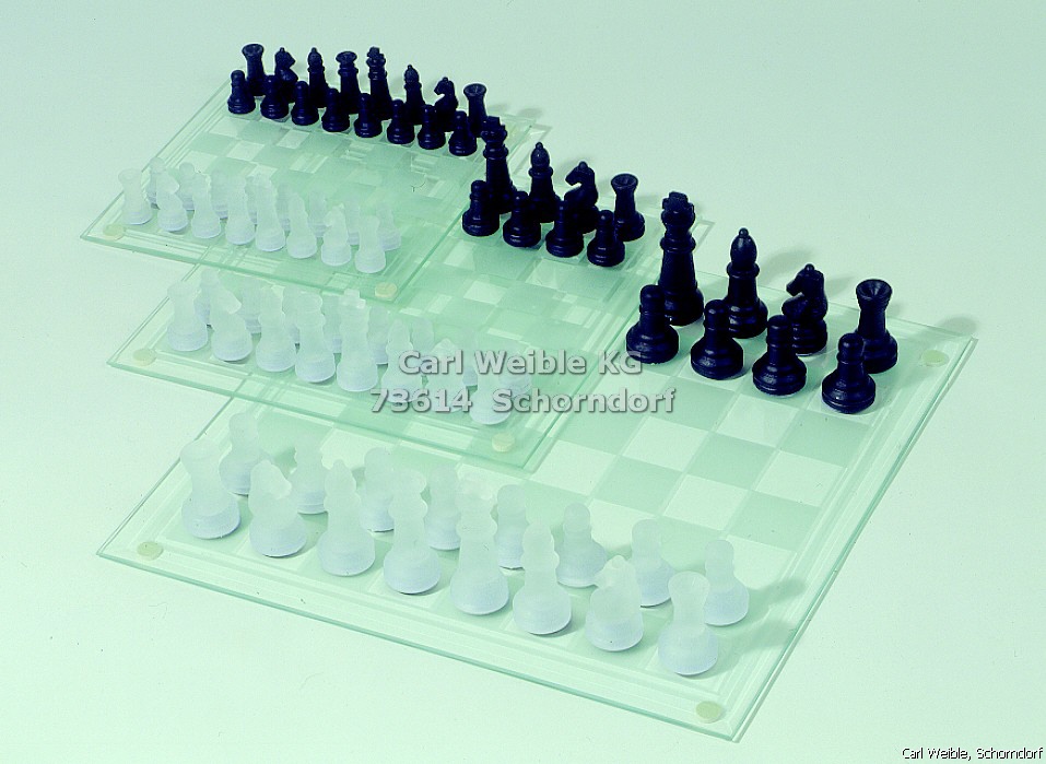 Glasschachspiele Schachfiguren Stauntonform aus Glas schwarz und weiß matt, mit Glas-Schachbrett klar du weiß, Geschenkkarton mit Tragegriff 150214 Größe 20 x 20 cm, Königshöhe 46 mm 150215 Größe 25 x 25 cm, Königshöhe 58 mm 150216 Größe 35 x 35 cm, Königshöhe 76 mm