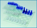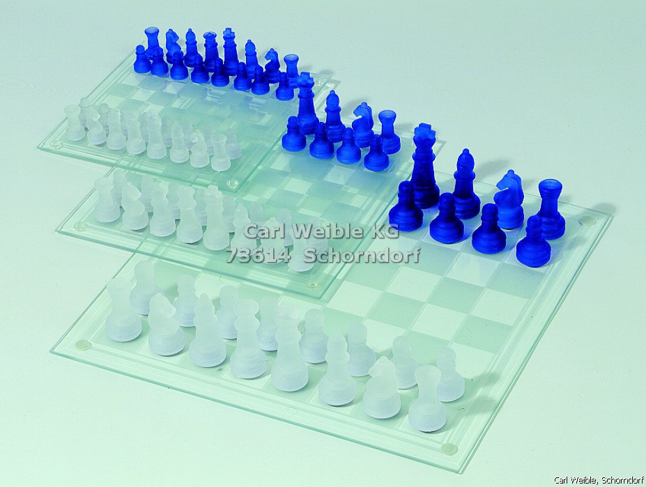 Glasschachspiele Schachfiguren Stauntonform aus Glas blau und weiß matt, mit Glas-Schachbrett klar du weiß, Geschenkkarton mit Tragegriff 150217 Größe 20 x 20 cm, Königshöhe 46 mm 150218 Größe 25 x 25 cm, Königshöhe 58 mm 150219 Größe 35 x 35 cm, Königshöhe 76 mm
