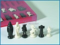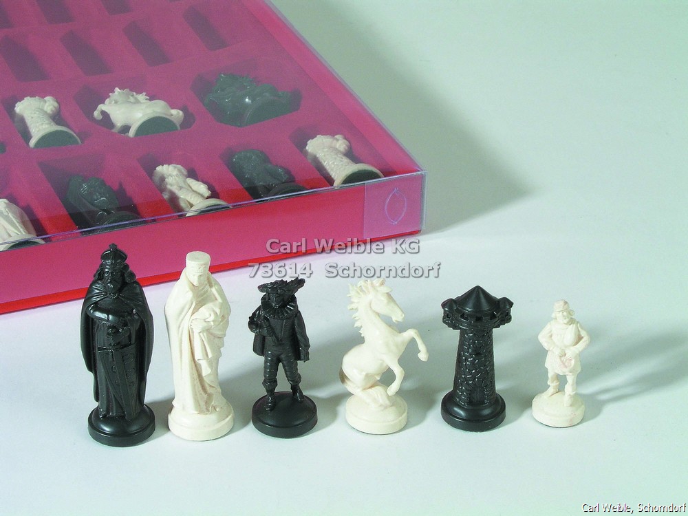 Schachfiguren „Mittelalter” Schachfiguren aus Kunststoff, schwarz und weiß, mit Filz, in Karton mit Klarsichtdeckel 01922