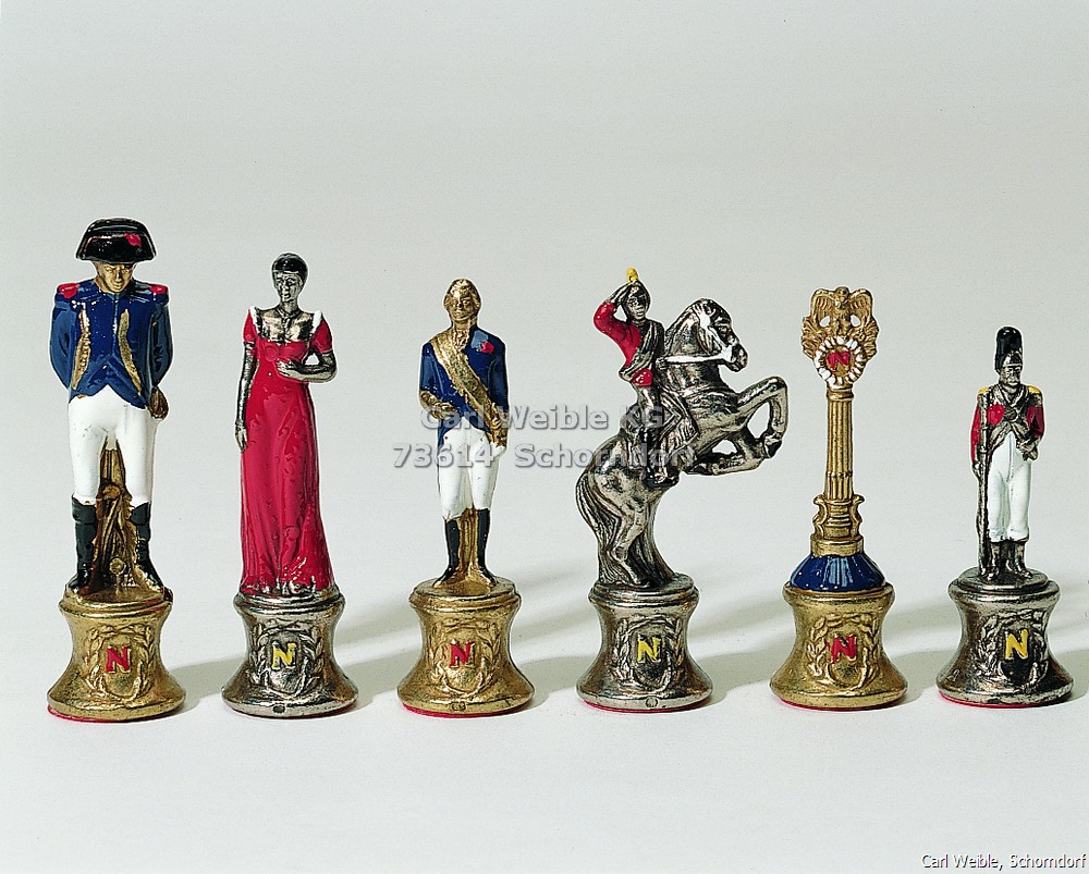 Schachfiguren „Napoleon“ Zink-Druckguss, gold- und silberfarbig eloxiert, handbemalt, mit Filz, in Kartonverpackung 01704 Königshöhe 87 mm