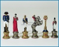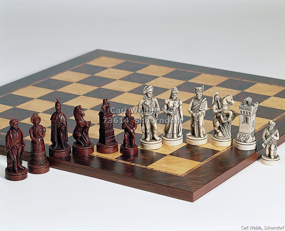 Schachfiguren „Schlacht bei Waterloo“ Handgegossene Zinnfiguren. Die berühmte Schlacht bei Waterloo im Jahre 1815. Die französische Armee geführt von Napoleon Bonaparte gegen die englische Armee unter dem Herzog von Wellington. Alle Schachfiguren werden einzeln gefertigt und von Hand bemalt, in schönem Kartonetui. 01724 Königshöhe 100 mm
