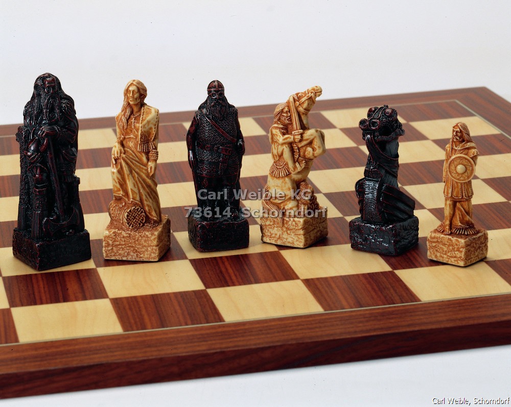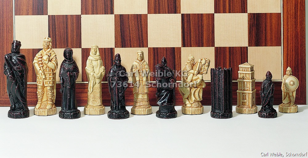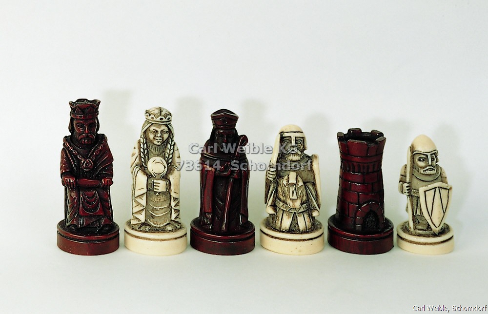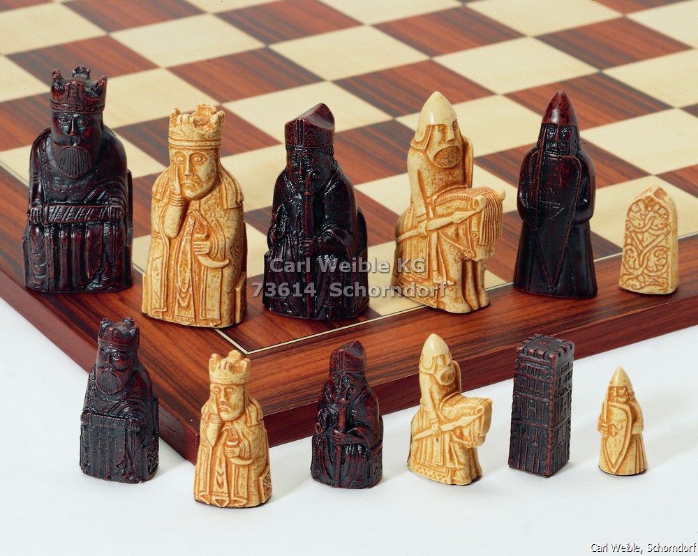 Schachfiguren „Isle of Lewis“ Nachbildungen der Figuren welche auf der Isle of Lewis an der Westküste Schottlands gefunden wurden, Die Originale befinden sich in Museen in London und Edinburgh. Es gilt nicht als sicher, dass es sich bei diesen Figuren um ein Schachspiel nach heutiger Spielweise handelte, da mehr als 32 Teile gefunden wurden, Der Turm bei den Figuren 01820 wurde von den Künstlern des Herstellers hinzugenommen, Gemahlener Stein mit Kunstharz gebunden, rotbraun und natur, mit Filz, in schönem Kartonetui mit Velourseinlage 01821 Königshöhe 95 mm
