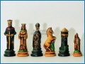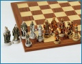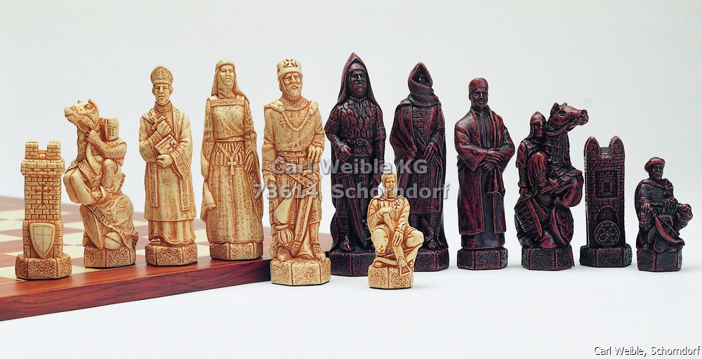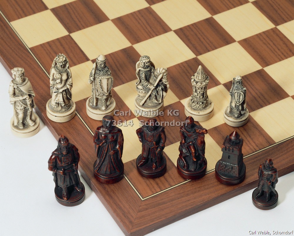Schachfiguren „Schlacht von Hastings“ In der Schlacht bei Hastings schlug ein normannisches Reiterheer unter Wilhelm dem Eroberer im Jahre 1066 die u Fuß kämpfenden Angelsachsen. Deren König Harald fiel im Kampf und Wilhelm errang die Krone. Gemahlener Stein mit Kunstharz gebunden, braun und natur, in Kartonverpackung 01860 Königshöhe 115 mm