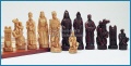 Schachfiguren „Kelten“ Die irischen Kelten unter ihrem König Brian Boru vertrieben die eingefallenen Wikinger bei einer verheerenden Schlacht bei Clontarf in der Nähe von Dublin im Jahre 1014. Gemahlener Stein mit Kunstharz gebunden, rotbraun und natur, mit Filz in schönem Kartonetui mit Velourseinlage 01858 Königshöhe 114 mm