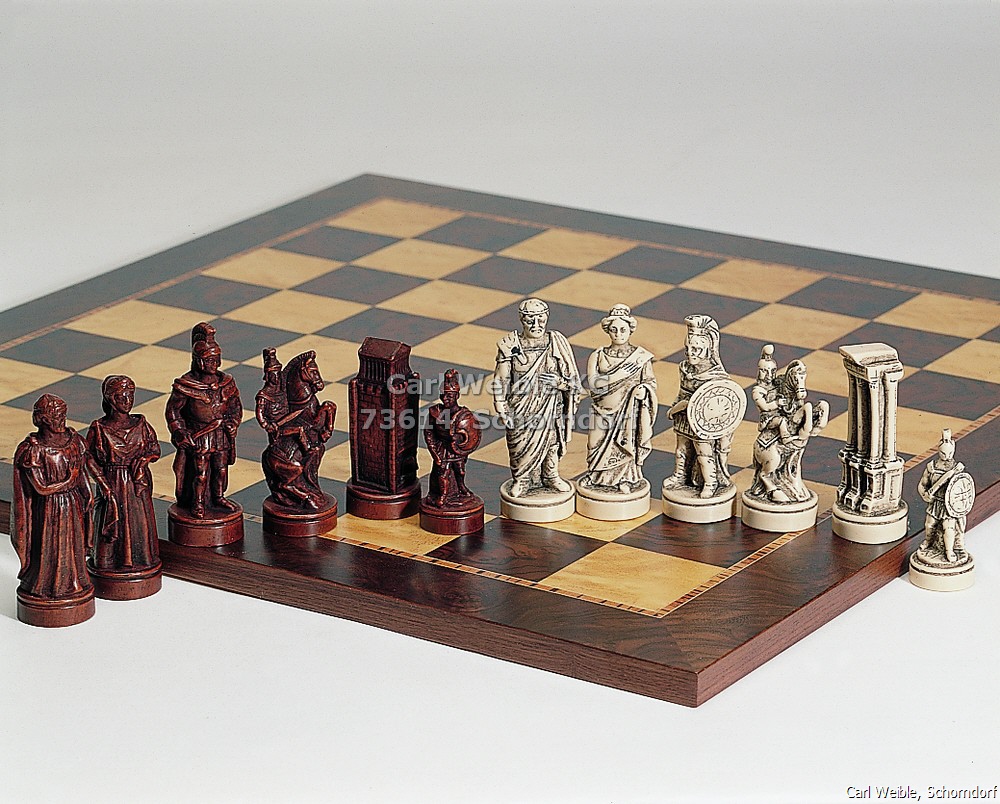 Schachfiguren „Römer gegen Germanen“ Zink-Druckguss, gold- und silberfarbig eloxiert, mit Filz, in Kartonverpackung 01709 Königshöhe 75 mm