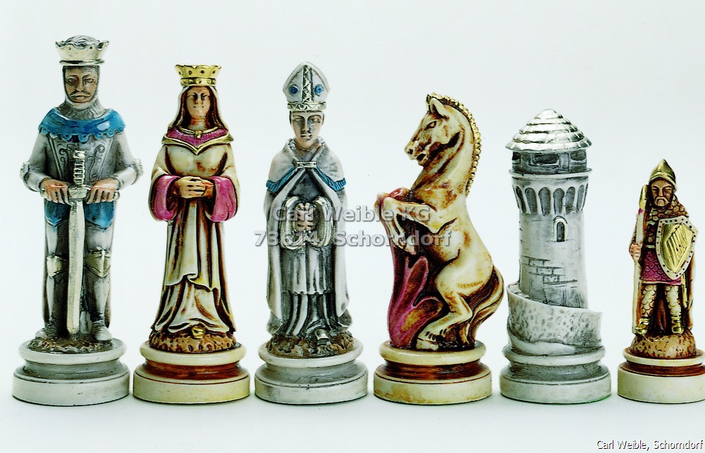 Schachfiguren „Mittelalter“ Gemahlener Stein mit Kunstharz gebunden, handbemalt, in Kartonverpackung 01835 Königshöhe 117 mm