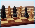 Schachfiguren „Warlords“ Verschiedene Charaktere aus der sagenumwobenen Zeit der Dunkelheit und dem Kampf zwischen den guten und den schlechten Mächten. Hier der Held Prinz Vallior gegen den Herrscher der Unterwelt Demonas. Gemahlener Stein mit Kunstharz gebunden , rotbraun und natur, mit Filz, in schönem Kartonetui mit Velourseinlage 01843 Königshöhe 127 mm