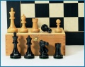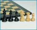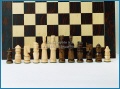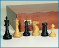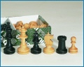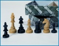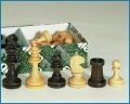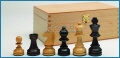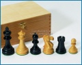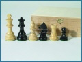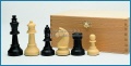 Schachfiguren Staunton-Form Teak und Buchsbaum schwarz gebeizt, poliert, mit Filz und Blei, handgeschnitzter Springer in Buchekassette 01611 Königshöhe 83 mm