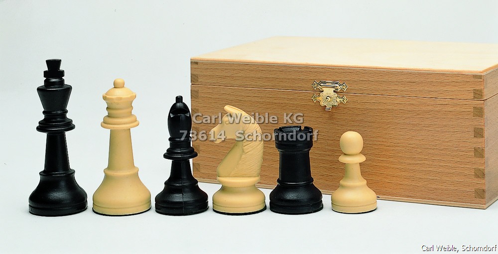 Schachfiguren „Turnier“ Kunststoff, schwarz und beige, schwere Ausführung, mit Filz. Von Turnierspielern und Schachclubs bevorzugte Figuren. Fast immer wird mit diesen Schachfiguren auf dem preiswerten Schachplan Nr. 02022 gespielt. 01016 Königshöhe 90mm, in Polybeutel 01017 Königshöhe 90 mm, in Buchekassette