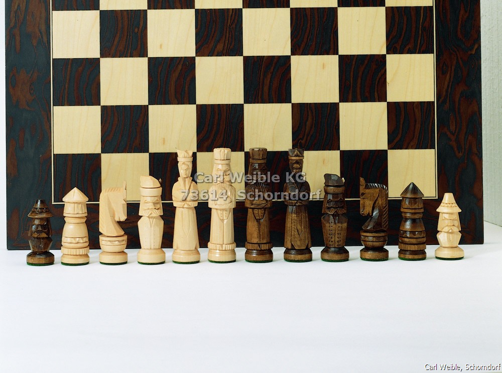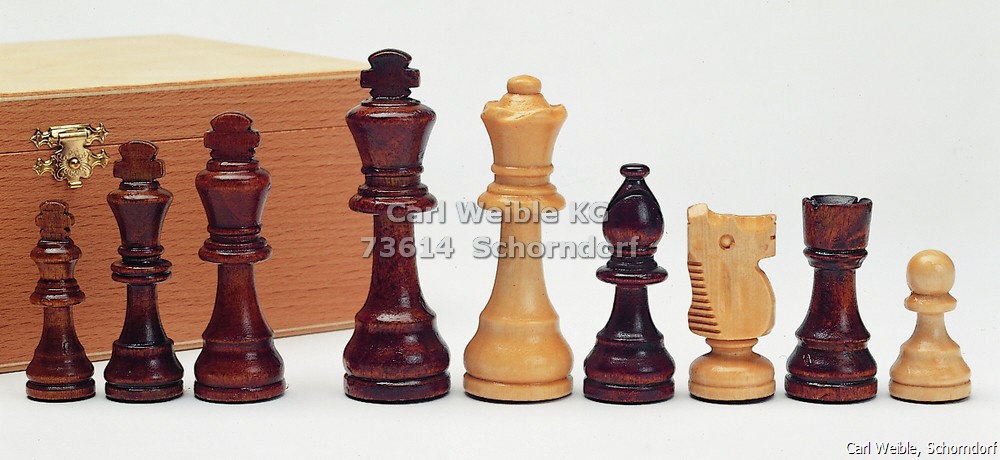 Schachfiguren Staunton-Form Buchsbaum, braun gebeizt und natur, poliert, mit Filz handgeschnitzter Springer im Klarsichtkarton 01091 Königshöhe 63 mm 01092 Königshöhe 70 mm 01093 Königshöhe 76 mm 01094 Königshöhe 83 mm