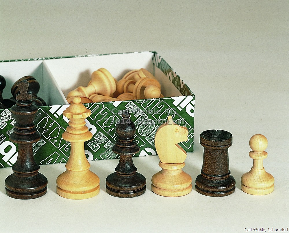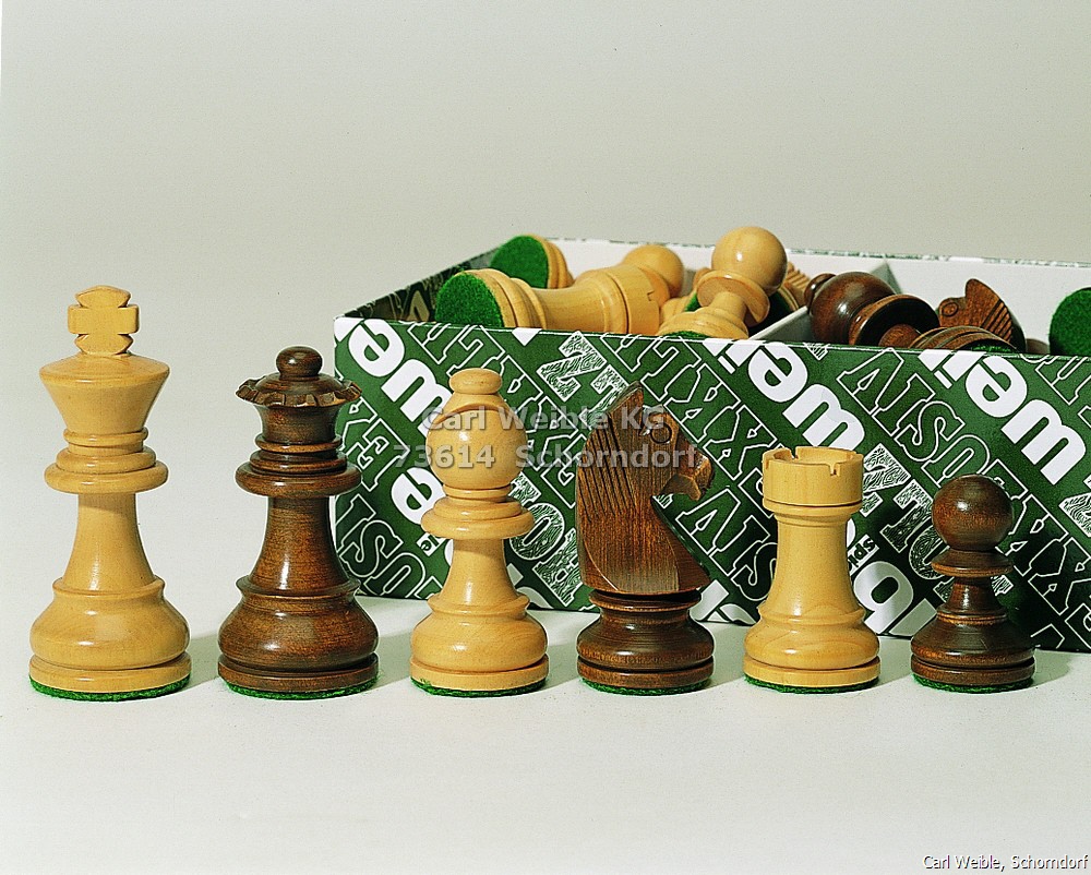 Schachfiguren Staunton-Form Ahorn, braun gebeizt und natur, lackiert, mit Filz und Blei, in Buchekassette 01070 Königshöhe 55 mm, ohne Blei 01071 Königshöhe 64 mm, 01073 Königshöhe 76 mm, 01070 Königshöhe 89 mm, turniergeeignet
