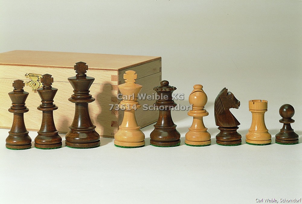 Schachfiguren Staunton-Form Buchsbaum, braun gebeizt und natur, poliert, mit Filz handgeschnitzter Springer, in Buchekassette 01141 Königshöhe 63 mm 01142 Königshöhe 70 mm 01143 Königshöhe 76 mm 01144 Königshöhe 83 mm