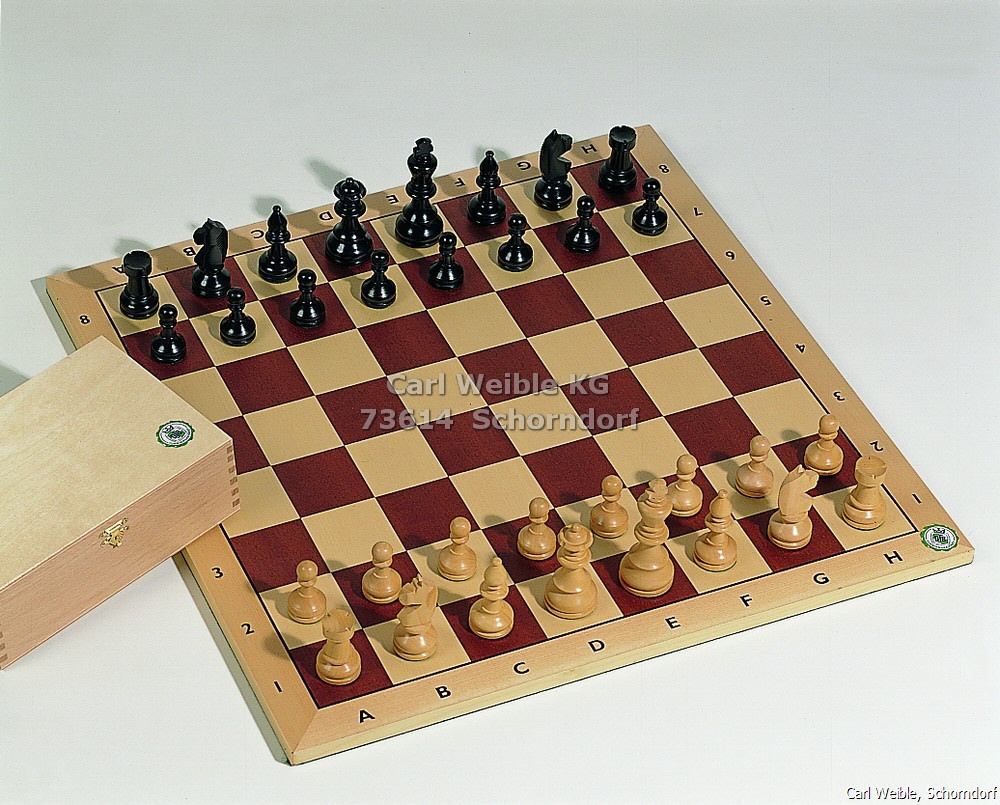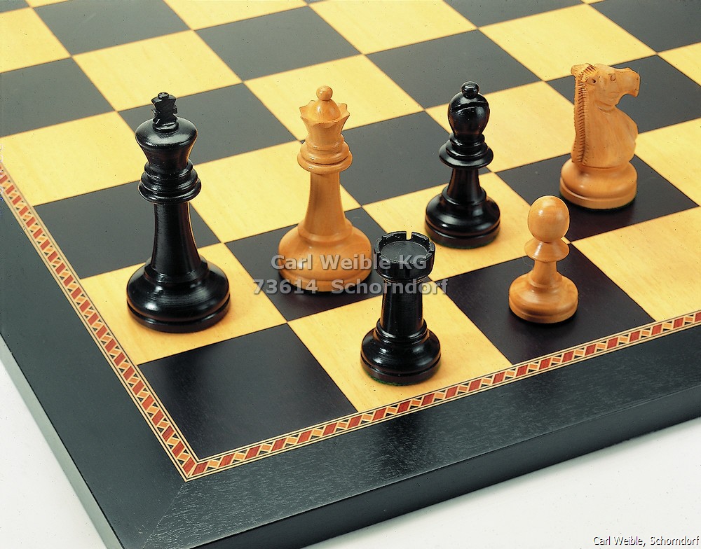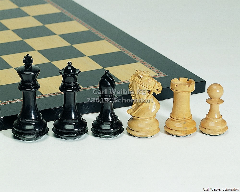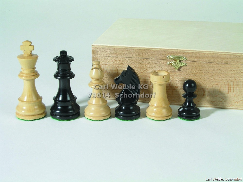 Internationale Turnier-Schachfiguren Fide-Normen, mit Gütesiegel, empfohlen vom Deutschen Schachbund Ahorn, schwarz gebeizt und natur, poliert, mit Filz und Blei, in Buchekassette 01159 Königshöhe 96 mm