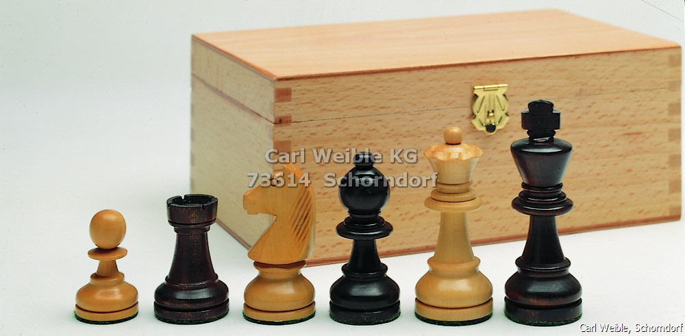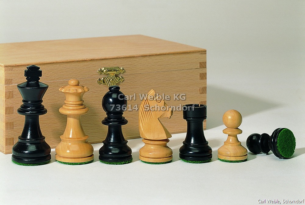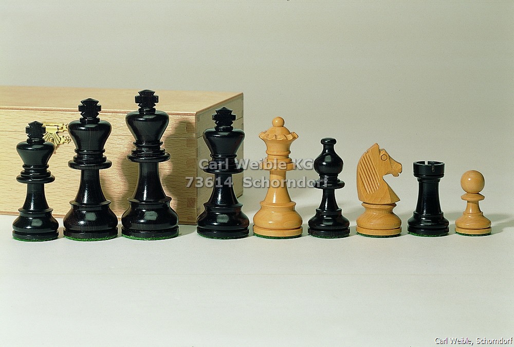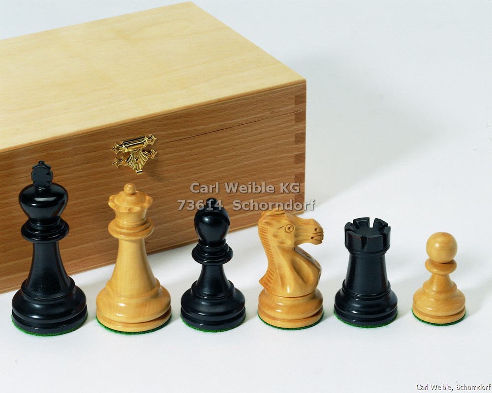 Schachfiguren Schachfiguren aus Buchsbaum schwarz und Natur poliert mit Filz und Blei, geschnitzter Springer, Buchekassette 01233 Königshöhe 76 mm 01234 Königshöhe 83 mm 01235 Königshöhe 89 mm 01236 Königshöhe 95 mm