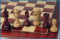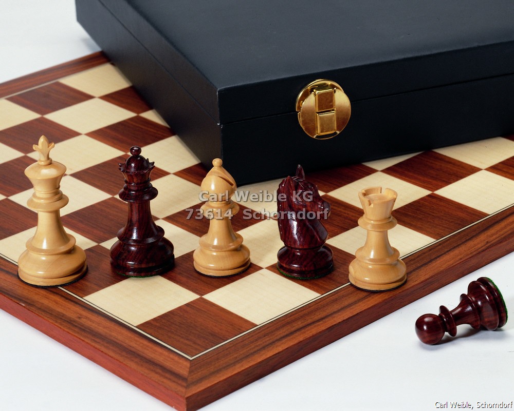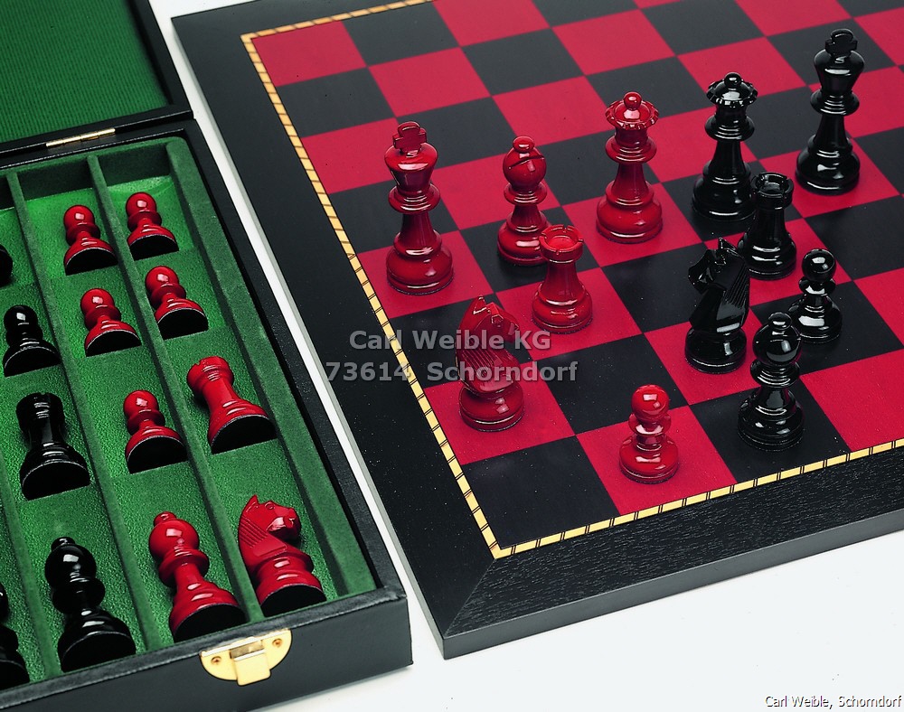 Schachfiguren Staunton-Form Buchsbaum, rot und schwarz gebeizt, Hochglanz veredelt, Sockel mit Leder anstatt Filz, Bleieinlage, handgeschnitzter Springer, in Etui mit Velourseinlage 01333 Königshöhe 76 mm 01335 Königshöhe 89 mm