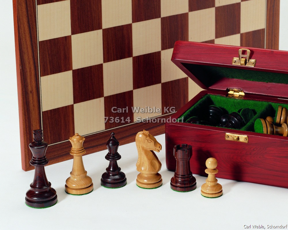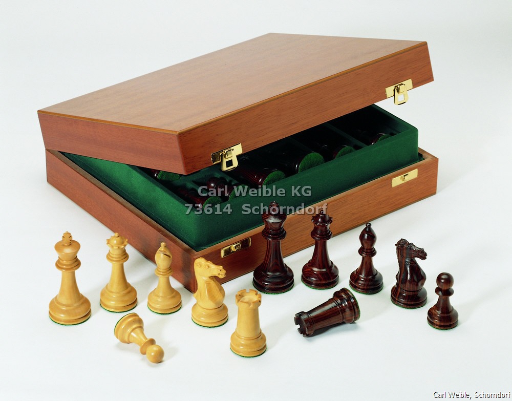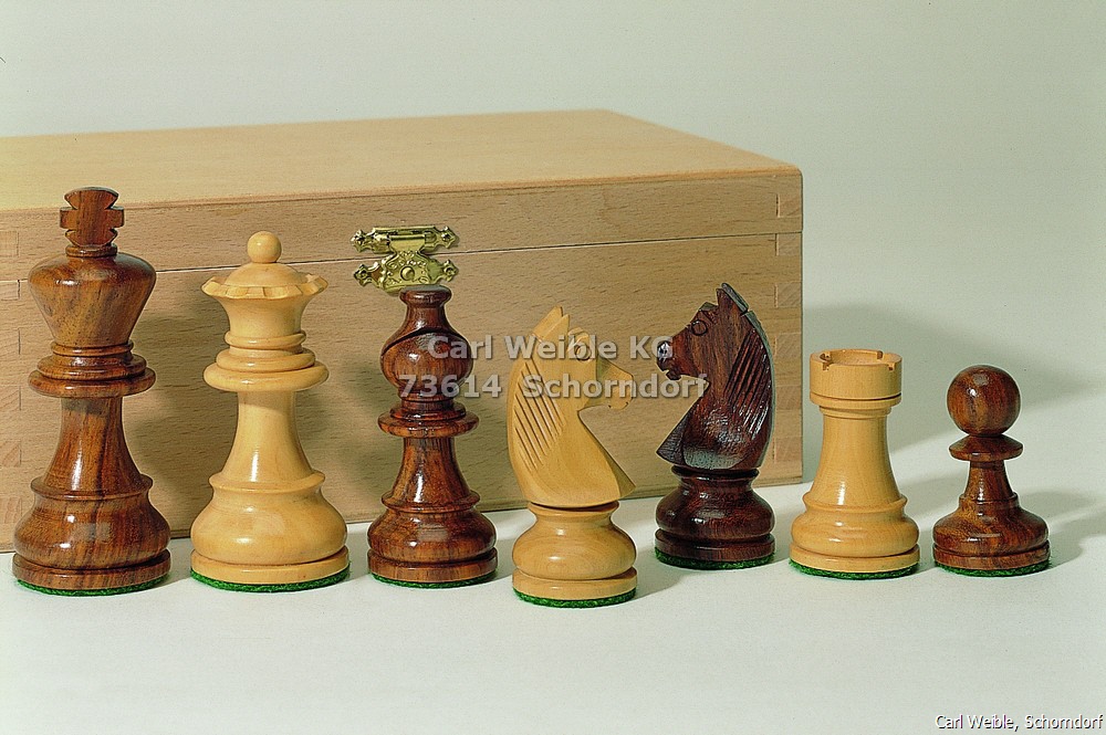 Schachfiguren Staunton-Form Palisander und Buchsbaum, poliert mit Filz und Blei, schöner handgeschnitzter Springer, in Buchekassette 01523 Königshöhe 76 mm 01524 Königshöhe 83 mm 01525 Königshöhe 89 mm