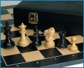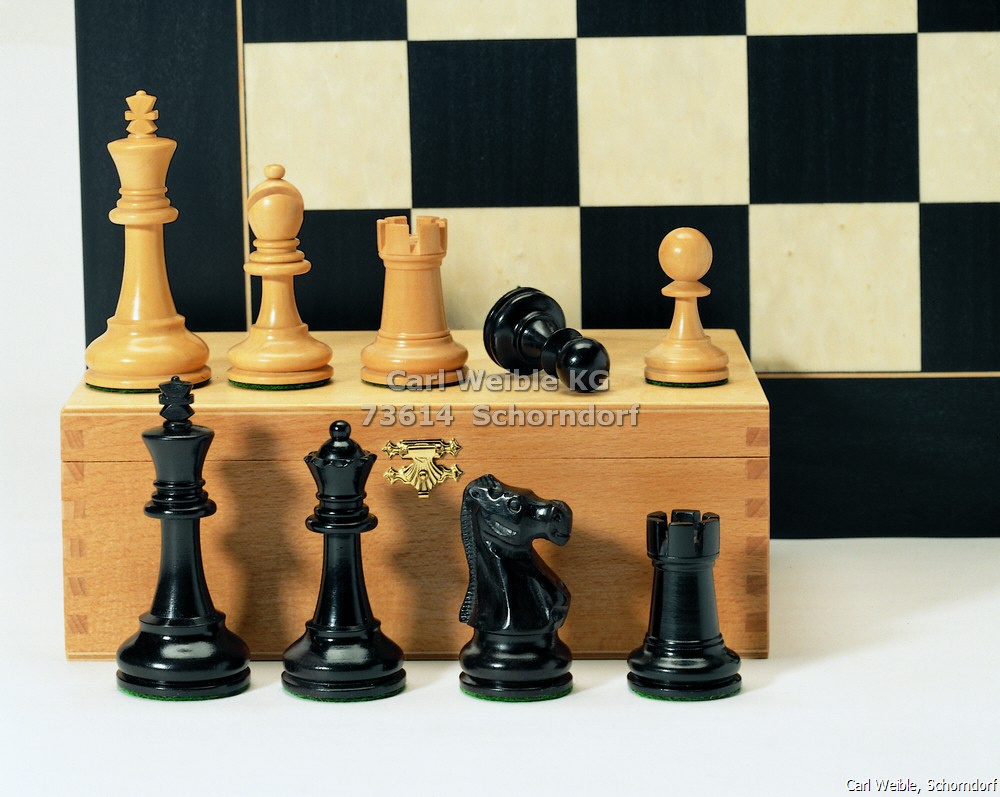 Schachfiguren Staunton-Form Buchsbaum, schwarz gebeizt und natur, poliert, mit Filz handgeschnitzter Springer, in Buchekassette 01223 Königshöhe 76 mm 01224 Königshöhe 83 mm 01225 Königshöhe 89 mm
