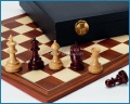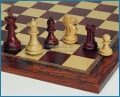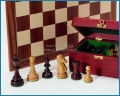 Schachfiguren „Top Tournament“ Palisander und Buchsbaum, poliert, mit Filz und dreifachem Blei, sehr schöner handgeschnitzter Springer, in massivem Mahagoni-Kasten 01609 Königshöhe 102 mm