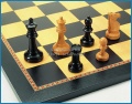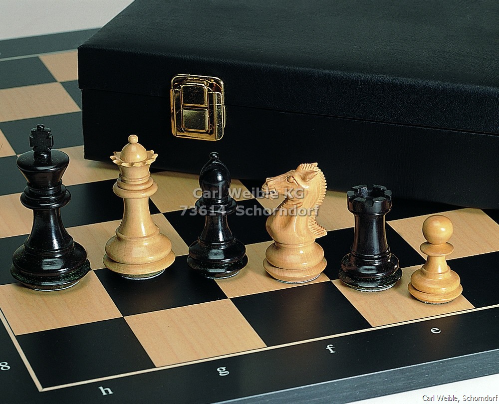 Schachfiguren „Grandmaster“ Ebenholz und Buchsbaum, poliert, mit Leder anstatt Filz und doppeltem Blei, schöner handgeschnitzter Springer, in Etui mit Velourseinlage 01566 Königshöhe 89 mm