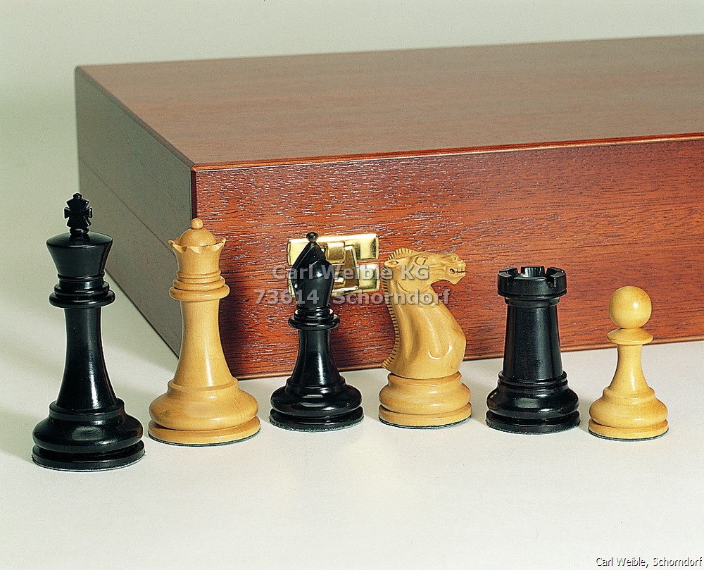 Schachfiguren „Top Tournament“ Ebenholz und Buchsbaum, poliert, mit Leder anstatt Filz und dreifachem Blei, sehr schöner handgeschnitzter Springer in massivem Mahagoni-Kasten mit Velourseinlage 01610 Königshöhe 102 mm
