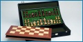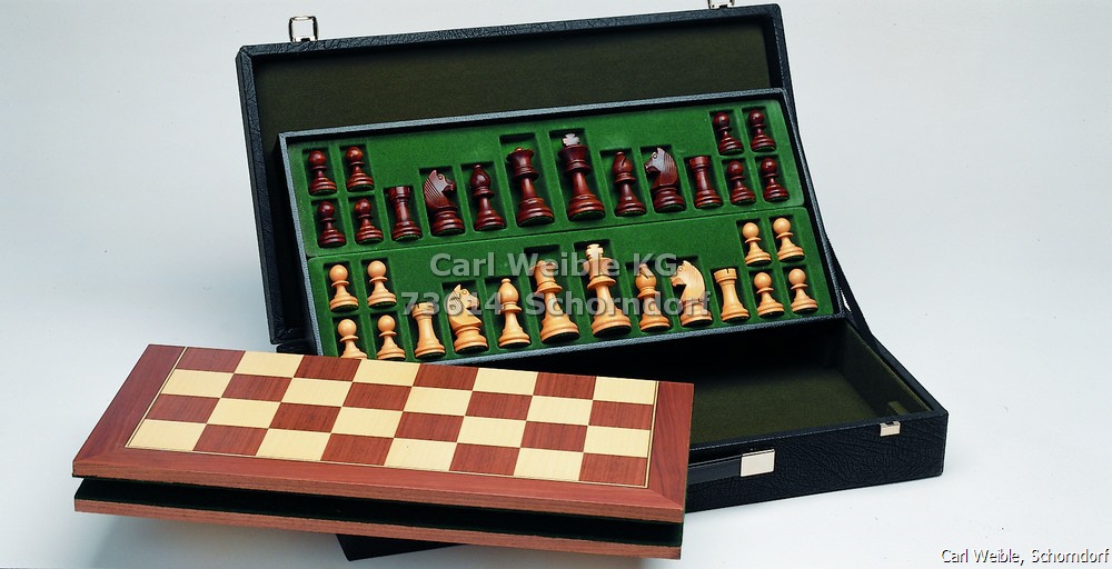 Schachkoffer, Luxus-Ausführung schwarzes Kunstleder, Schachfiguren Buchsbaum, braun und natur, mit Filz, faltbares Schachbrett Nussbaum und Ahorn, Intarsie, matt lackiert03333 Feldgröße 45 mm, Koffer 47 x 24 cm , Königshöhe 76 mm