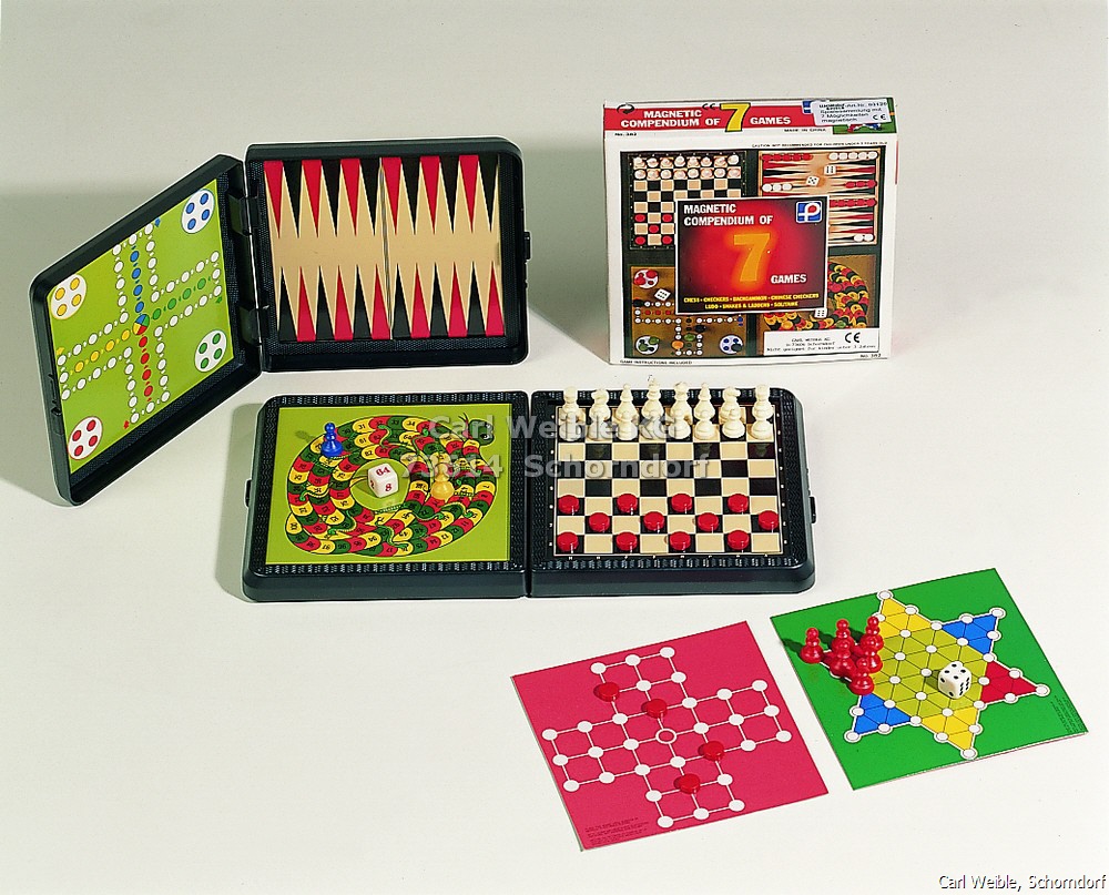 Spielesammlung magnetisch, aus Kunststoff, zwei zusätzliche Spielfelder aus Pappe, in Geschenkkarton 7 Spielmöglichkeiten, Schach, Dame, Backgammon, Ludo, Schlangen-Spiel, Halma und Solitär 03120 Größe 14 x 14 cm