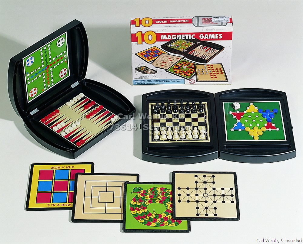Spielesammlung magnetisch, aus Kunststoff, sehr praktisch durch zwei zusätzliche magnetische Spielplatten, in Geschenkkarton 10 Spielmöglichkeiten, Schach, Dame, Mühle, Backgammon, Ludo, Schlangen-Spiel, Halma, Solitär, Fuchs und Henne und Tic Tac Toe 03124 Größe 21 x 15 cm