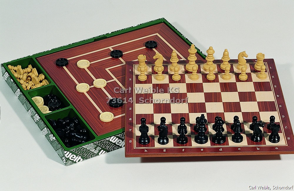 Schach, Dame und Mühle, Spiel Schachfiguren aus Kunststoff, Königshöhe 55 mm, Spielsteine aus Kunststoff, Schachbrett bedruckt, Feldgröße 30 mm, Rückseite Mühle, Brett 28 cm, in Klarsichtkarton 03362 Karton 35,5 x 31 cm