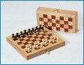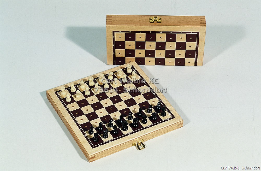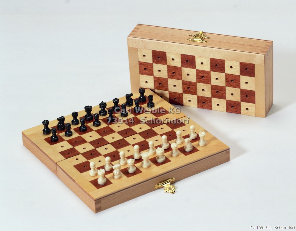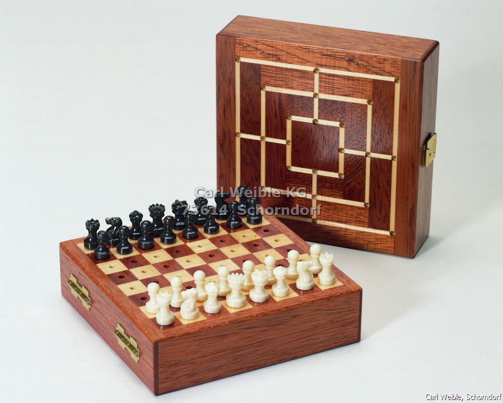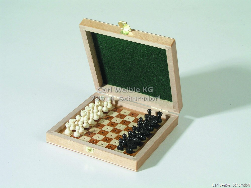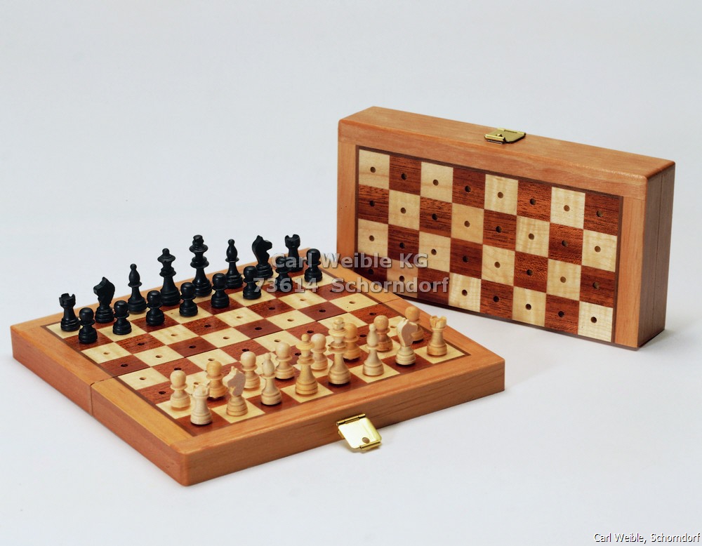 Steck-Schachspiel Steck-Schachspiel aus Erle, innen Mahagoni und Ahorn Intarsie, 12,5 x 12,5 cm, Schachfiguren aus Kunststoff 03024