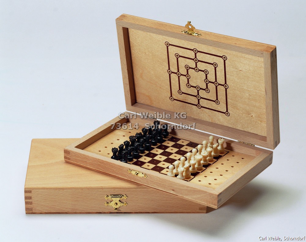 Steckschach- und Mühlespiel Buche und Birke, bedruckt 03004 Kunststoff-Figuren, 13,5 x 13,5 cm