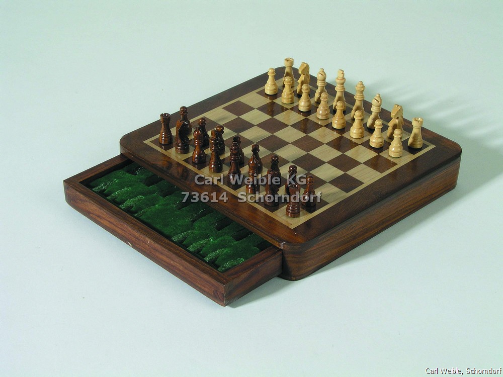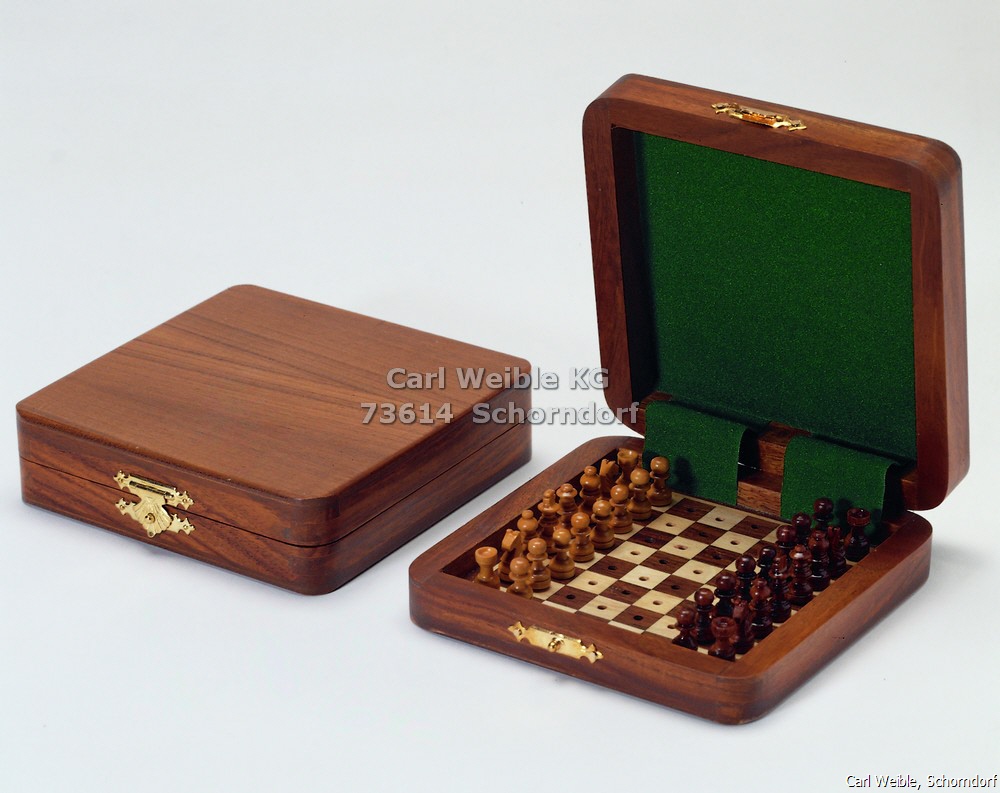 Magnet-Schachspiel Magnet-Schachspiel mit Schubfach, massiv Palisander und Ahorn, Intarsie, Holzfiguren aus Palisander und Buchsbaum, 16,5 x 16,5 cm 03059