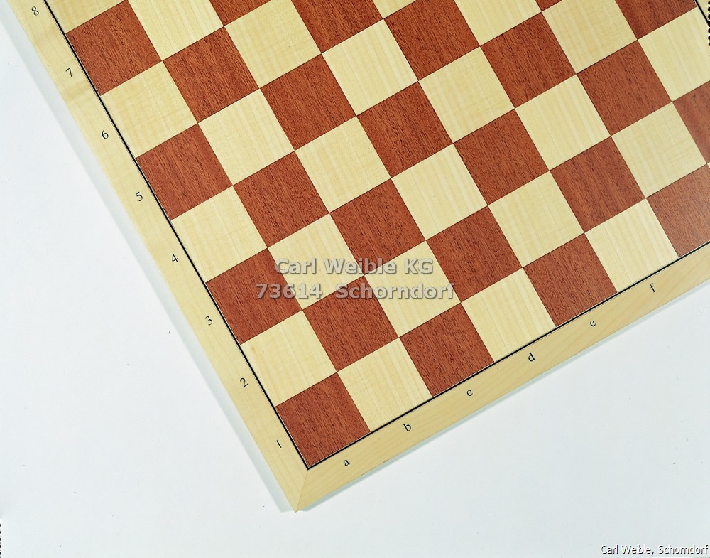 Internationales Turnier-Schachbrett Fide-Normen, mit Gütersiegel, empfohlen vom Deutschen Schachbund Mahagoni und Ahorn Intarsie, matt lackiert, mit Zahlen und Buchstaben bedruckt, Rückseite ganzflächig mit Filz 02547 Feldgröße 58 mm, Brett 51,5 cm