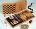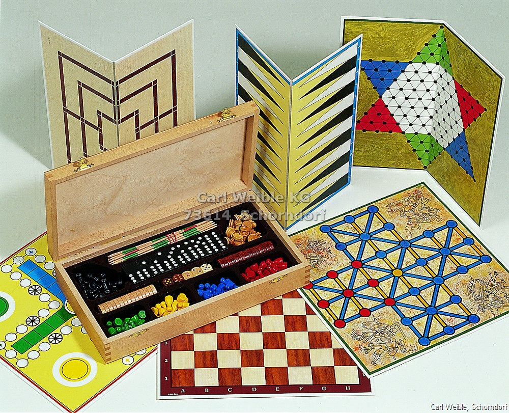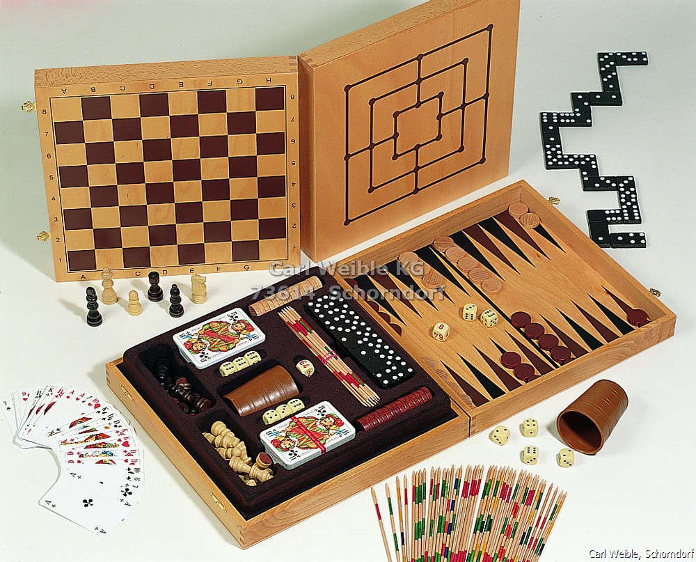 Spielesammlung in Holzkassette Buche natur, matt lackiert, Spielfelder aufgedruckt, Schach, Dame, Mühle, Backgammon. Zusätzlich Mikado und Domino aus Holz, Würfelbecher und 6 Würfel, Skat- und Romme´-Spielkarten, Spielsteine aus Holz 04179 30 x 30 x 6,5 cm