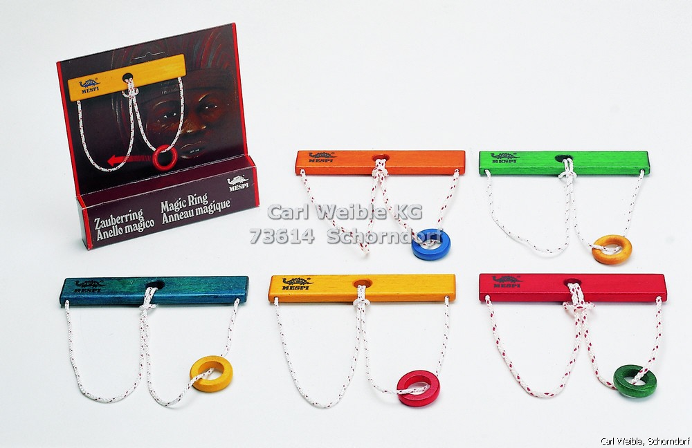 Zauberring Wer schafft es, den Holzring von der rechten Schlaufe in die linke Schlaufe zu bringen? Zauberei oder Trick? Massivholz gebeizt und matt lackiert, in Geschenkverpackung, 15 x 17 x 2 cm 11500 verschiedene Farben